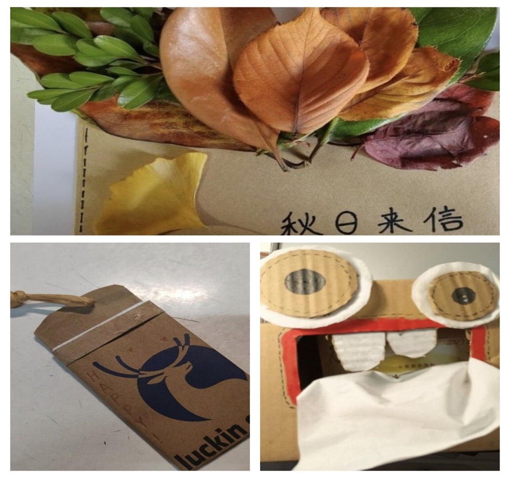 本次活动以利用双十一大量包装废物为切入点,引导同学们树立节约意识,利用自身的创造力和想象力用旧物创造出新的价值。同学们积极参与,以快递纸盒、秋日落叶、奶茶包装等旧物为原材料,发挥自身想象力,依靠旧物自身特性,用灵巧的双手创造出了抽纸盒、信封、模型车等独具匠心的作品。