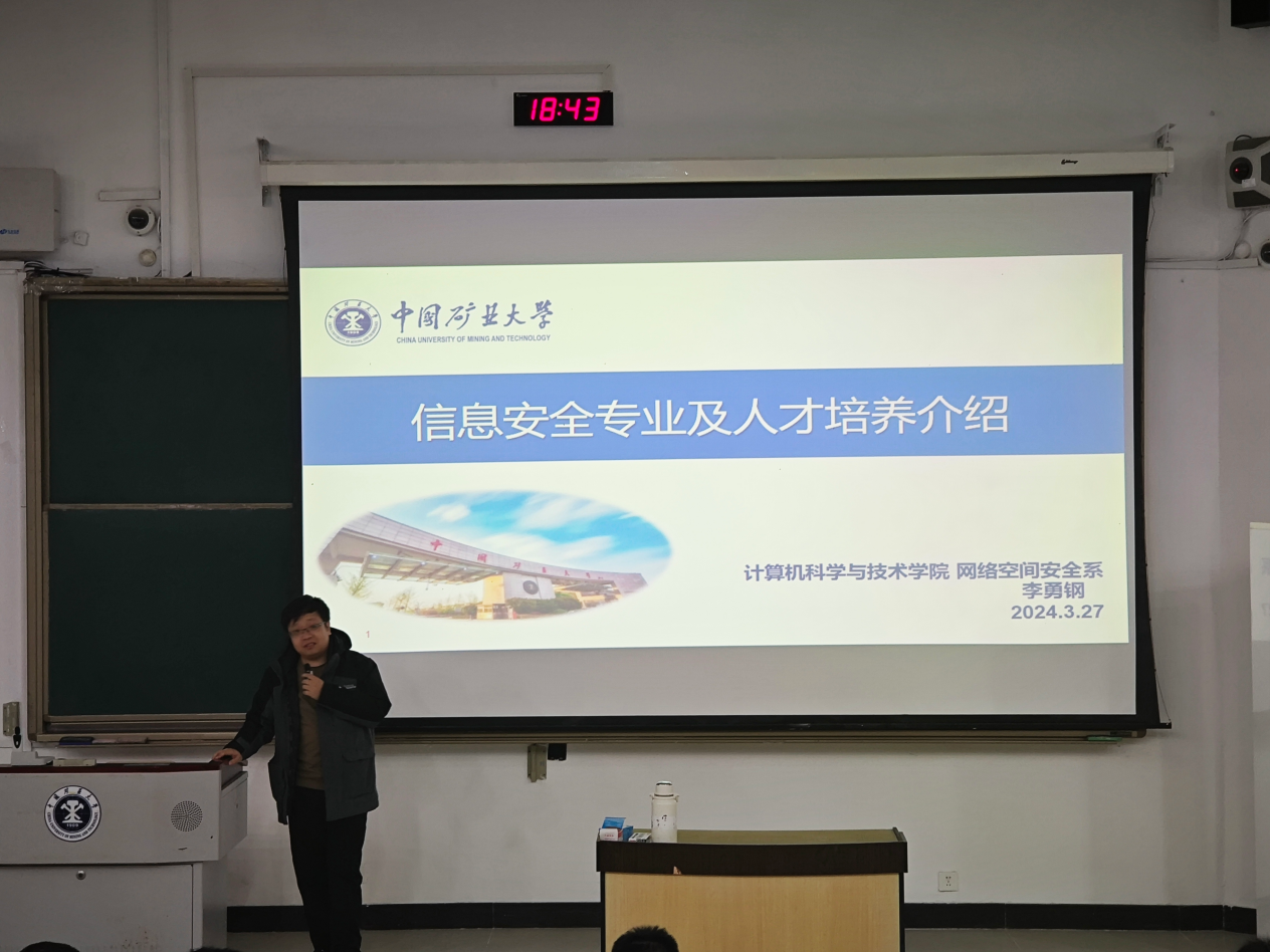 李勇钢老师用两个例子说明了信息安全对于国家安全的重要性,并结合学生的实际情况、就业环境阐述了信息安全专业的未来优势与专业优势。
