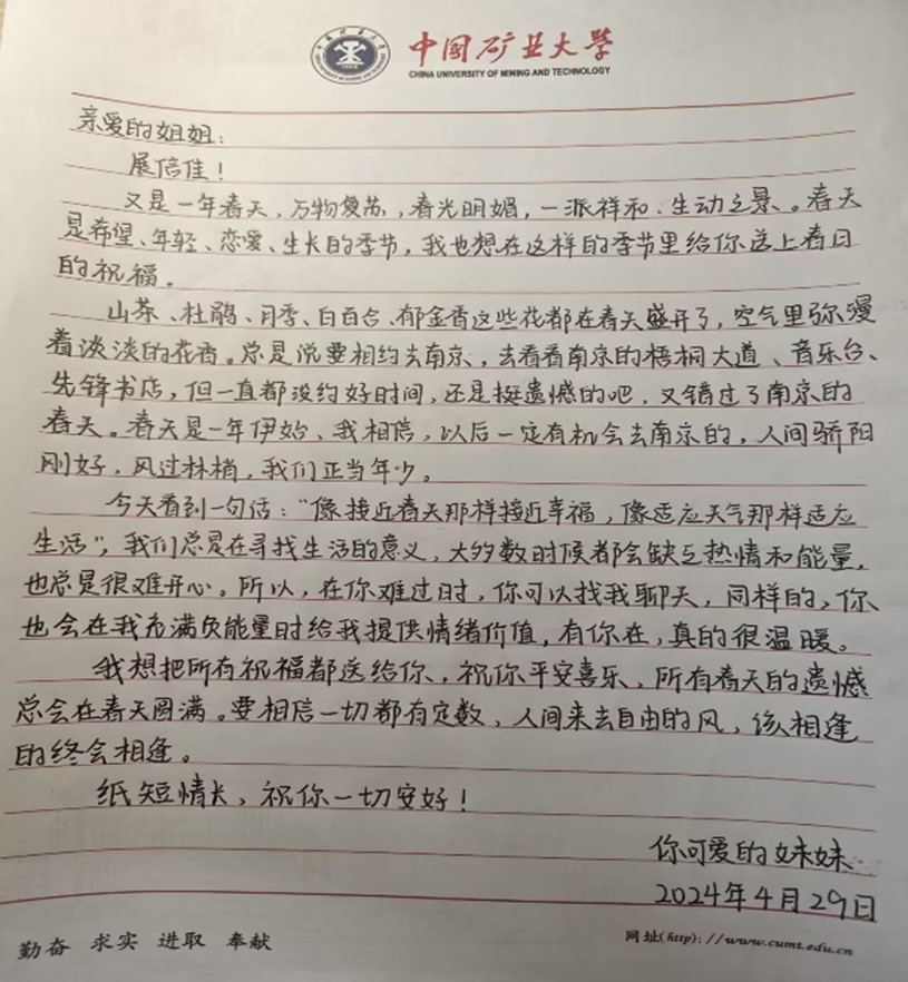 春日来临,万物复苏,为了让同学们在快节奏的生活里也记得生活中为我们默默付出的朋友、家人们,增强与他们的沟通交流,计算机学院学生会与计算机学院青协联合化工学院、数学学院等9个学院于4月9日至5月7日开展了“春日来信”活动。
